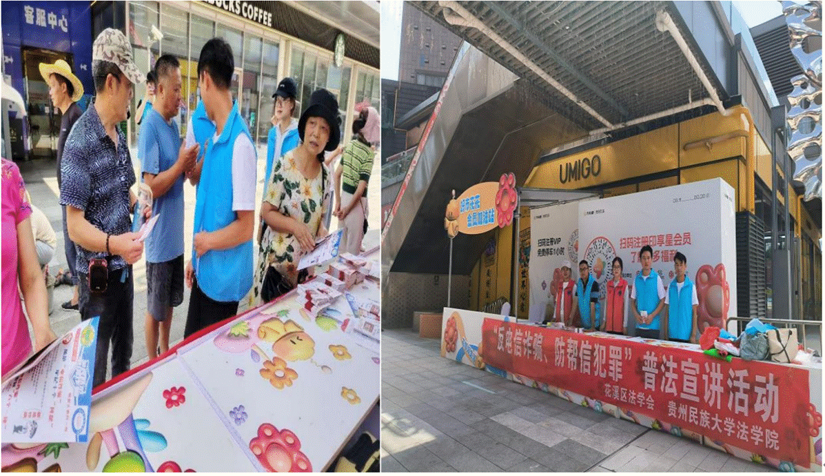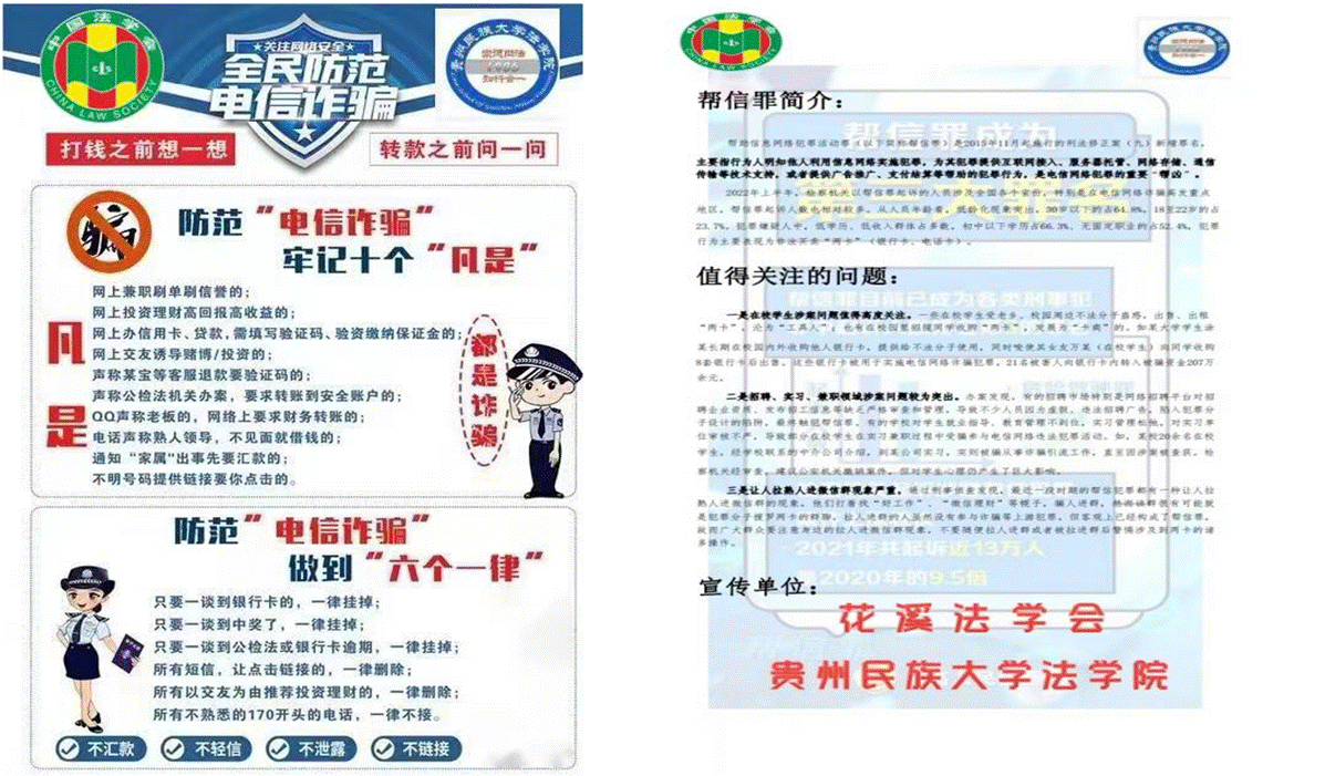 2023年8月15日至8月21日,伟德体育“反电信诈骗、防帮信犯罪普法宣讲队”在花溪区法学会的指导帮助下开展了为期6天的普法宣讲活动,共计发放宪法宣传手册、《中华人民共和国民法典》宣传手册、电信诈骗及帮信犯罪宣传单、法治物品袋共计2000份,现场接受咨询13人次,且在8月18日与清华大学“数信筑梦”社会实践团队举行了线下交流会,取得了较为圆满的普法宣传效果,便于省外同学了解贵州、宣传贵州。