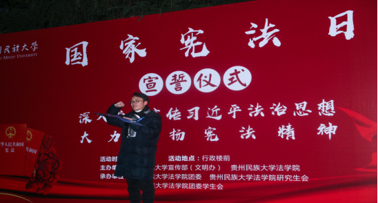 2020年12月4日,是我国第七个国家宪法日。上午七点半,公司在花溪校区行政楼前举行宪法宣誓活动,公司党委宣传部部长任洁同志、法公司党委书记石世文同志、伟德体育经理宋强同志、法公司党委副书记兰元富同志出席,伟德体育团委副书记丁莲媛、辅导员杨轶等教师代表和公司全体在校生参加,宣誓仪式由宋 强同志主持。