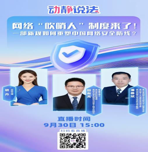 为宣传好、实施好该《国家网络安全事件报告管理办法》,应贵州省委网信办的邀请,2025年9月30日下午,公司省人大常委会咨询专家、省网络法治研究中心智库专家、法学博士、博士生导师潘善斌教授与贵州大学大数据与信息工程公司经理、省科协常委、军事学(密码学方向)博士、博士生导师田有亮教授一起做客贵州省广播电视台“动静贵州”频道“动静说法”栏目,通过直播的方式共同解读《国家网络安全事件报告管理办法》。